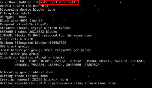 从信息中可以看到这里有两块磁盘,其中第二块磁盘为用户添加的数据盘,需要格式化。输入【mkfs.ext3 /dev/sdb1】命令格式化磁盘,其中/dev/sdb1 为需要格式化的磁盘名。